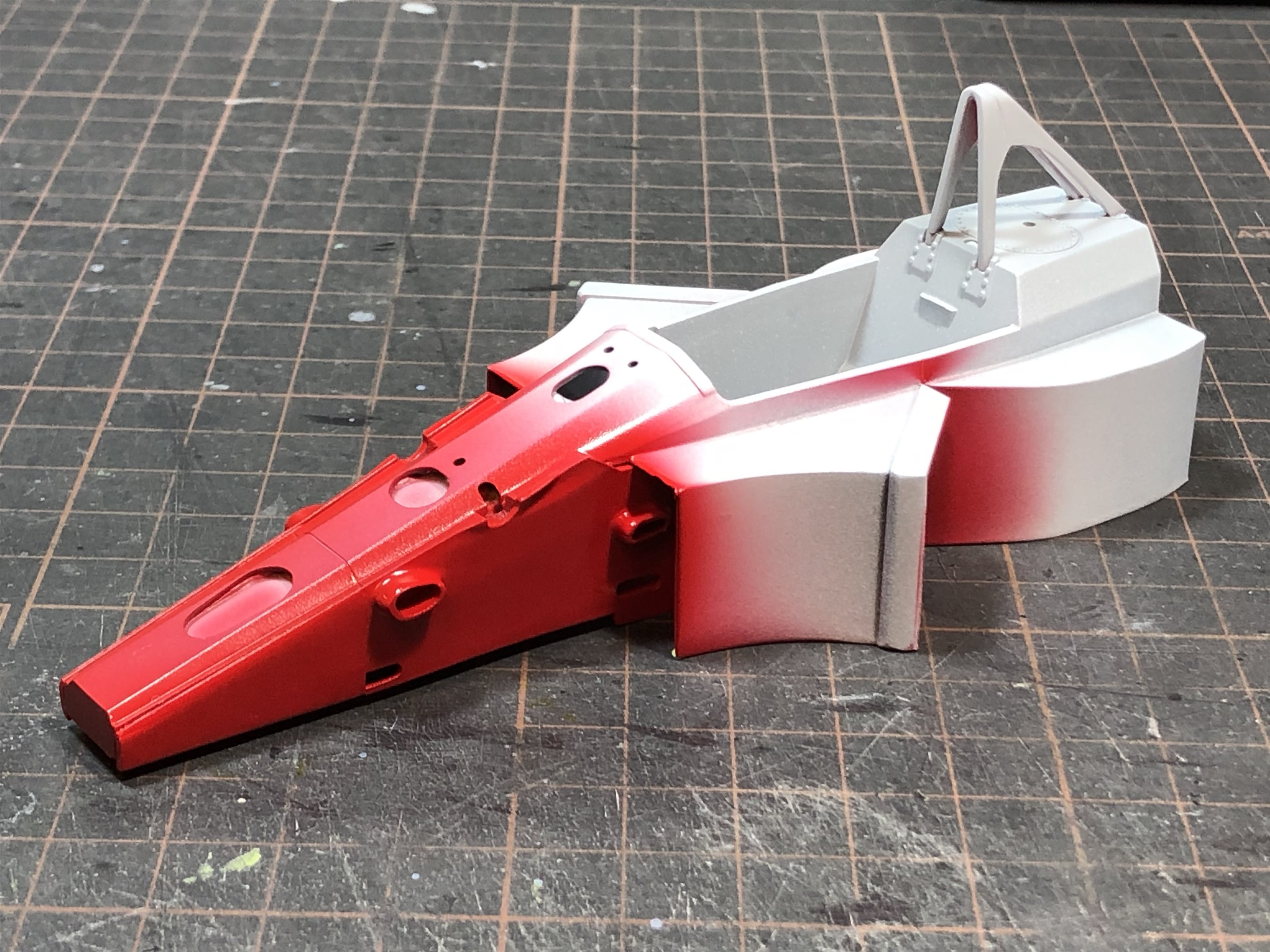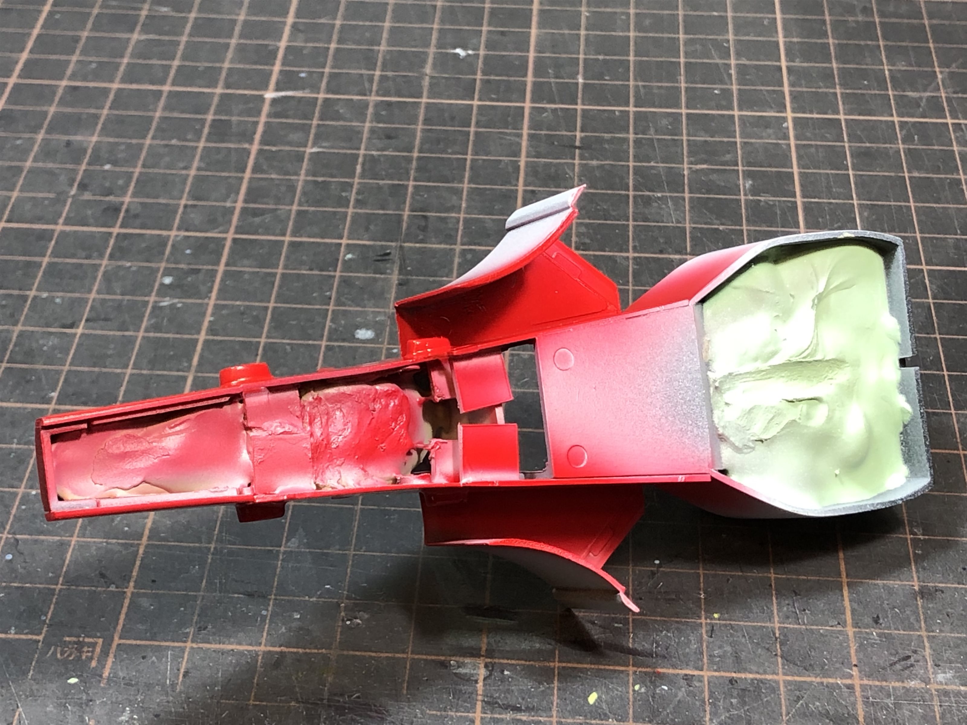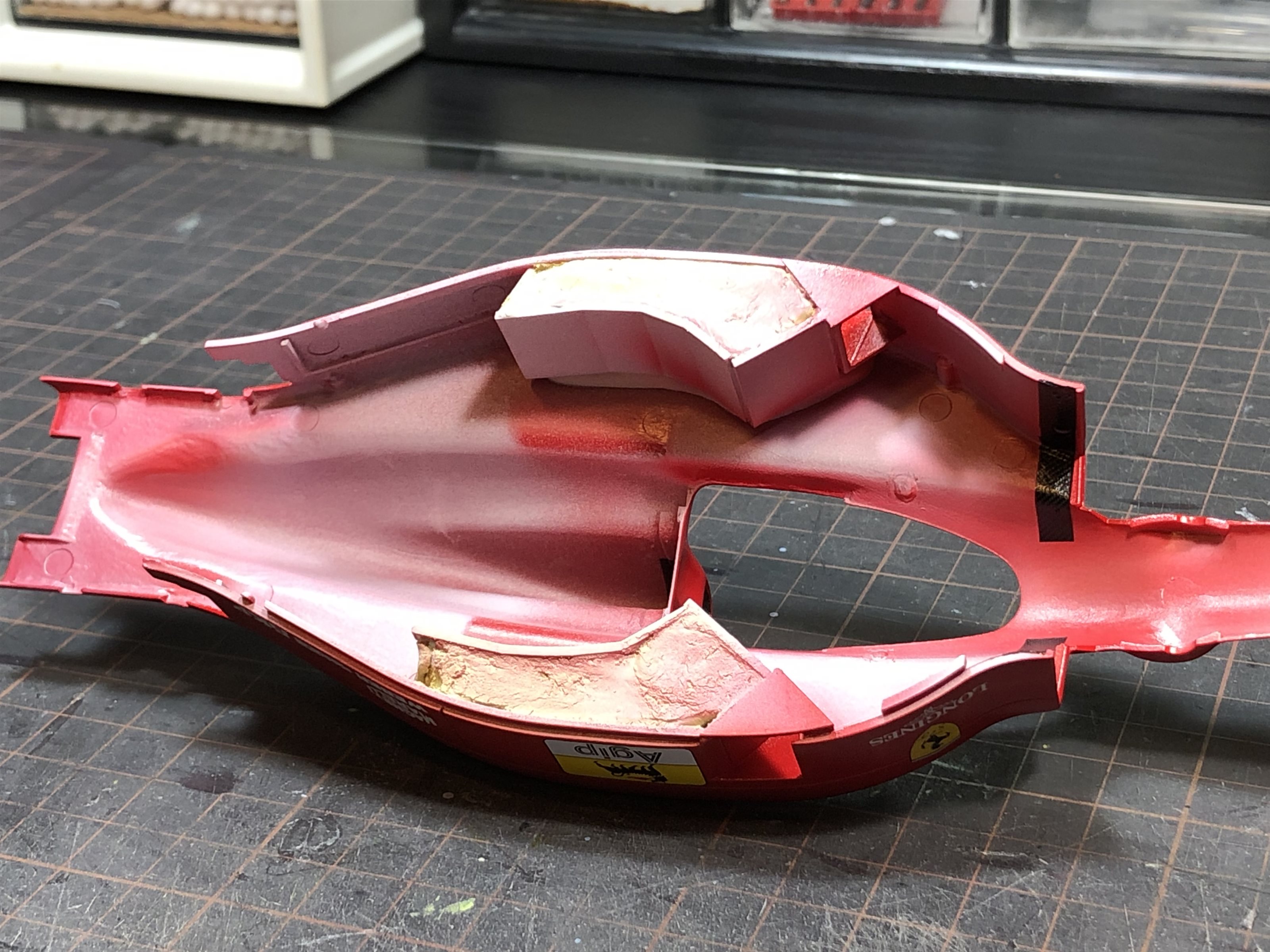 F93Aと同時にF189後期も製作中です。サイドポンツーン側面のカウルと上面のカウルの合わせをピタピタにするために、最初から接着してしまいます。重さフェチなので空間にはパテを充填しました(笑